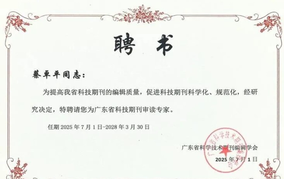 学会秘书长蔡卓平博士获聘广东省科技期刊审读专家
