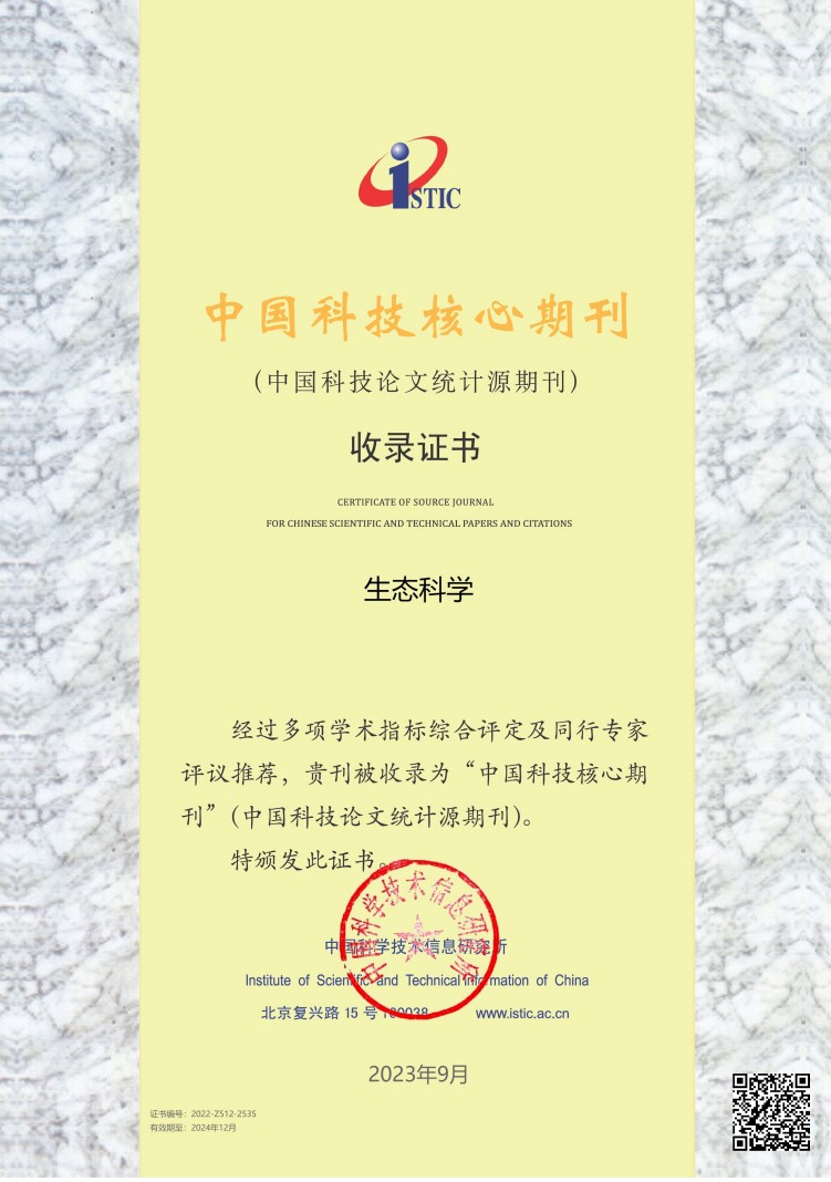 2023年9月20日,中国科学技术信息研究所发布“中国科技核心期刊目录(2023年版)”,《生态科学》继续被收录为“中国科技核心期刊”(中国科技论文统计源期刊)。
