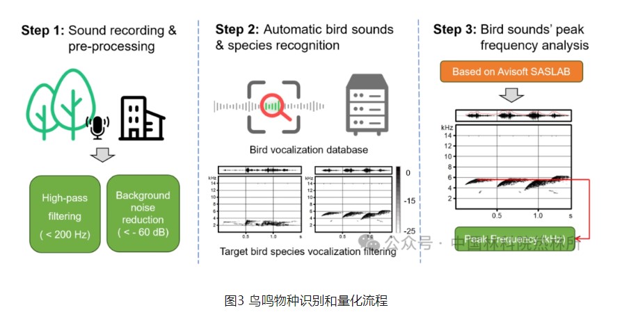 (1)创新提出了基于被动声学监测+人工智能算法的生态声学研究框架。在广州市不同城乡梯度下的城市绿地中,开展了连续一年的被动声学监测(2021.10-2022.10),积累约1.35 TB的环境声数据;为在海量的声音数据中快速准确地识别和分析目标声音特征,分别构建了城市声场景分类模型和城市噪声背景下的鸟鸣识别模型,得到了城乡梯度下的声场景和鸟类鸣声数据库。同时,为更加全面地揭示城市化对生物多样性的影响机制,研究还量化了监测点的人工噪声特征;并结合遥感影像和地基激光雷达技术,客观评价了声音监测点位附近的土地利用数据和植被结构数据。(2)综合分析了发声群落尺度上,各类声学场景的声学特征及其对环境因素的响应机制。结果表明,城市声场景与土地利用格局关系密切,生物声相关场景更多的出现在森林环境中;人为噪音侵占了低频声学空间,重塑了城市森林的声学生态位;与体积和密度相关的植被结构因子影响了鸟类鸣声和城市噪声在城市森林中的传播特性,这体现出城市森林为鸟类提供发声空间中的重要作用。(3)综合分析了鸟类物种尺度上,鸟类鸣声主频的差异及其对噪声和植被结构的响应机制。结果表明,城市核心区的鸟类鸣声主频显著高于城郊地区;低频高能的人工噪声和栖息地空间结构是构成城市鸟类声学空间的重要因素;人工噪音、城市化程度和的林下空间的增加都是导致鸟类鸣声主频增加的因素,而植被密度和树高等植被因素可能会减缓这种上升趋势。系列研究从生态声学视角,系统地阐明了鸟类鸣声对城市化响应的两个关键科学问题:①不同的城市化地区的鸟鸣多样性存在明显差异;②人工噪音和栖息地特征均是塑造鸟类发声空间的重要因素。系列研究结果为城市化背景下鸟类多样性保护提供了重要启示,同时应更加关注和保护以鸟鸣为代表的城市自然之声,构建合理的城市森林植被结构或优化城市空间格局,进而实现维持城市生物多样性。相关研究成果以“Assessing the effect of human activities on biophony in urban forests using an automated acoustic scene classification model”“Can urban forests provide acoustic refuges for birds? Investigating the influence of vegetation structure and anthropogenic noise on bird sound diversity”和“Anthropogenic noise and habitat structure shaping dominant frequency of bird sounds along urban gradients”为题,先后在《Ecological Indicators》《Journal of Forestry Research》和《iScience》等国际知名期刊上发表,热林所郝泽周博士为第一作者,热林所裴男才副研究员、中山大学刘阳教授、广州大学张承云副教授等为通讯作者。系列研究得到国家自然科学基金项目(32201338)、广东省林业科技创新项目(2021KJCX017)、广州市科技计划项目(2023A04J0086)、深圳市南亚热带植物多样性重点实验室开放基金课题、中山大学高校基本科研业务费(09020-31670001)等资助,相关成果为珠三角高品质森林城市群和绿美广东生态建设提供了科技支撑。