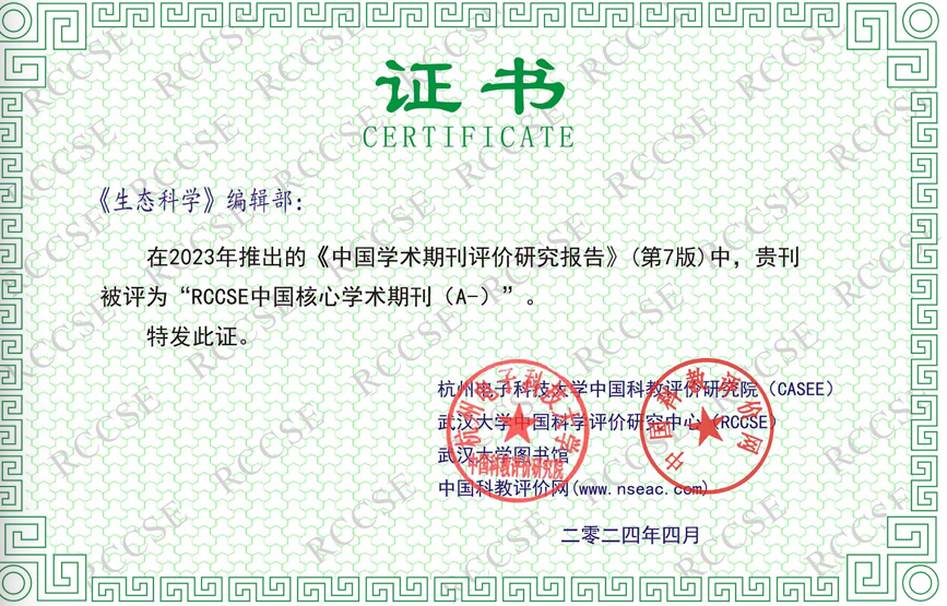 近日,杭州电子科技大学中国科教评价研究院、武汉大学中国科学评价研究中心、武汉大学图书馆、中国科教评价网联合发布“中国学术期刊评价研究报告(第七版)”,《生态科学》入选“RCCSE中国核心学术期刊”之“中文核心学术期刊(A-)”。这是《生态科学》首次入选“中文核心学术期刊”,标志着办刊质量取得新的突破。